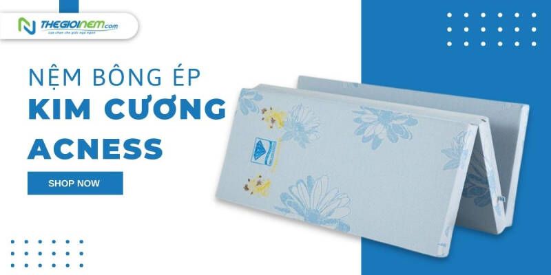 Nệm được làm từ sợi bông bông polyester tiêu chuẩn được ép chồng lên nhau dưới nền nhiệt cao tạo thành khối, tăng cường độ nén và duy trì độ đàn hồi. Lớp áo nệm được làm từ vải nhập khẩu cao cấp, thêu hoa văn và logo tinh tế, màu sắc trang nhã mang lại vẻ đẹp sang trọng cho sản phẩm. Thiết kế nệm bông ép Kim Cương Acness thông minh dạng gấp 3 tiện dụng dễ dàng di chuyển, tiết kiệm không gian khi không sử dụng.