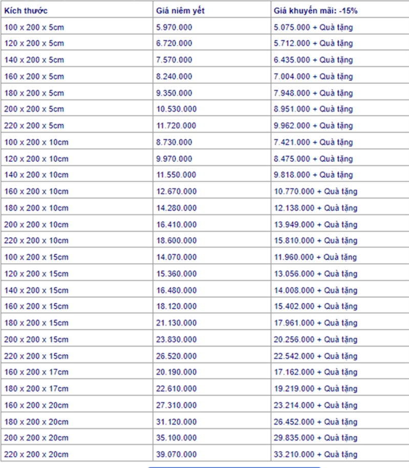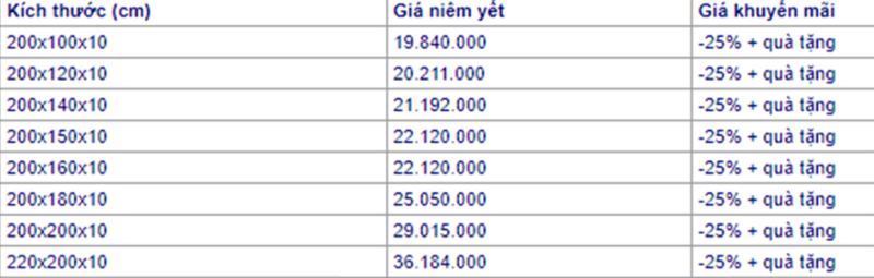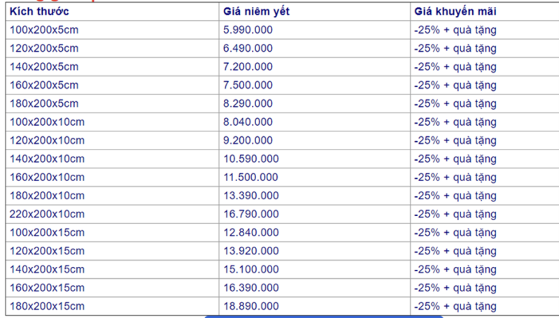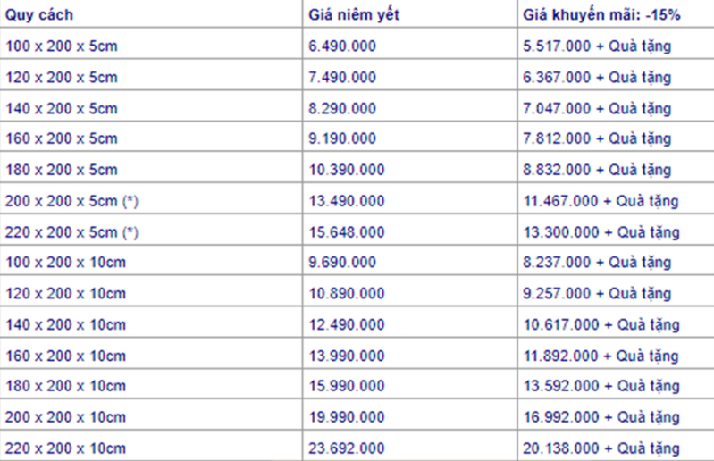 Bảng giá nệm cao su Liên Á