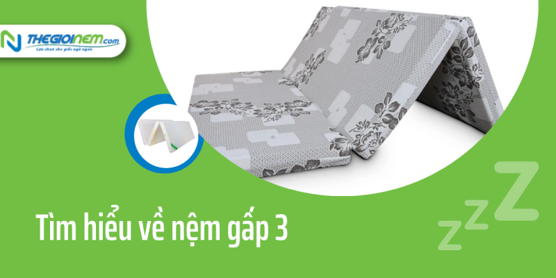 Nệm gấp 3 là loại nệm được chia thành 3 lớp có kích thước giống nhau, có thể gấp gọn lại thành đoạn nhỏ để tiện lợi cho việc bảo quản hoặc di chuyển. Nệm gấp 3 được sử dụng phổ biến trong các căn hộ vừa và nhỏ hoặc kí túc xá để tiết kiệm không gian.
