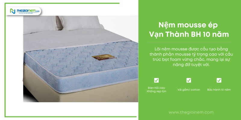 Chất liệu: Nệm mousse ép Vạn Thành BH 10 Năm được làm từ nguồn nguyên liệu thiên nhiên, không chất độc hại, đảm bảo an toàn cho người sử dụng. Nệm có độ đàn hồi cao, không lún, xẹp. Vỏ nệm sử dụng bằng chất liệu vải cotton và vải gấm, độ bền cao, hình thức đẹp