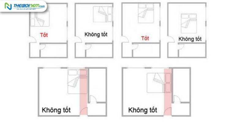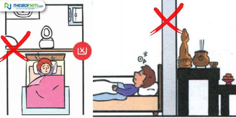 Không kê giường ngủ đối diện cửa nhà vệ sinh, nhà tắm: Theo thuyết phong thủy thì người nằm ngủ ở vị trí này thường hay bị chứng đau đầu thường xuyên. Từ đó hiệu suất lao động không cao, kinh tế cũng dần giảm sút.